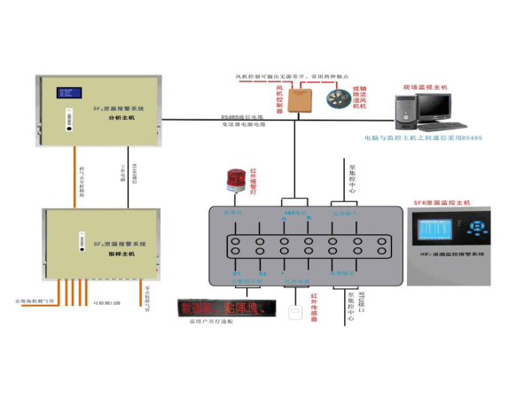 系统概述ZD2000B型气体泄漏定量报警系统主要应用在变电站内35KVSF6开关室及500KV、220KV、110KVGIS室对SF6组合电器设备室环境中SF6气体泄漏情况和空气中含氧量进行实时监测。极大地提高了无人值守变电站运行的安全性,特别是对日常巡视和维护人员的人身安全得到可靠的保障。主要由监测主机、SF。/0,双气体变送器、风机控制器及辅助功能组成。系统结构上更加小巧,安装更加简单。适合面积较小的场合,节省投入成本。系统组成1、监测主机主要完成系统绝大部分控制、协调、显示、输出等功能。采用的是TFT真彩工业级显示屏,图形化界面设计,操作更加方便,多种外形设计,适合现场安装。2、SF./O双气体变送器主要完成对SF/O的检测功